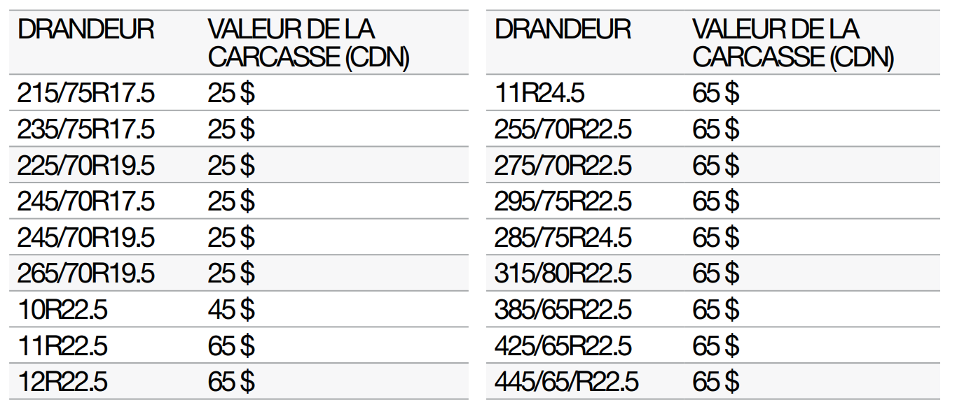 Si un défaut de fabrication et de matériaux est détecté dans un pneu radial ROVELO pour poids lourd dans les premiers 2/32 po ou 10 % de la bande de roulement d’origine utilisable, selon la première éventualité, ROVELO remplacera ce pneu par un pneu neuf comparable. Les frais de montage et d’équilibrage sont aux frais du propriétaire. Ajustement au prorata Si un défaut de fabrication et de matériaux est détecté dans un pneu radial ROVELO pour poids lourd après les premiers 2/32 po de la bande de roulement d’origine, un crédit sera accordé pour l’achat d’un nouveau pneu ROVELO comparable ; valeur au prorata basée sur la profondeur de bande de roulement utilisable restante sur le pneu retourné par rapport à la bande de roulement d’origine utilisable du pneu neuf. Les taxes applicables sur le pneu neuf et les frais de montage et d’équilibrage seront aux frais du propriétaire. Les ajustements sur les pneus n’étant plus équilibrés ou affichant une usure ovalisée ne sont autorisés que pour les premiers 2/32 po ou 10 % de la bande de roulement d’origine, selon la première éventualité.